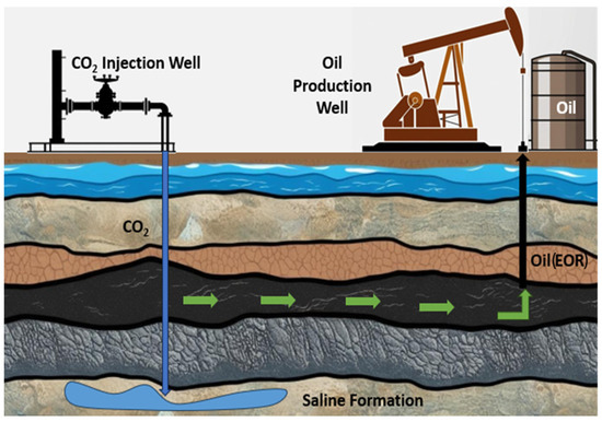 - Deep saline aquifers are ideal for CO2 storage due to their vast capacity, deep location, and the multiple natural trapping mechanisms they offer. Found at depths greater than 800 m, these aquifers consist of porous rock formations filled with highly saline water, providing ample space to store CO2 under high pressure, where it becomes a supercritical fluid [57]. Impermeable caprock layers prevent CO2 from escaping, while residual trapping, solubility trapping, and mineral trapping ensure long-term containment. Additionally, saline aquifers are widely distributed globally and do not compete with freshwater resources, making them a key option for large-scale carbon sequestration.