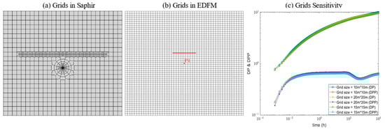 A model containing a single fracture and a single vertical well at the center of the gas reservoir was used as the benchmark for validating the model proposed in this study. The physical dimensions are 1000 m × 1000 m × 20 m, with a fracture length of 100 m, an aperture of 0.001 m, and a permeability of 10,000 × 10−3 μm2. The fracture is located 50 m away from the vertical well. The gas properties are listed in Table 1, and the selection of various parameters was based on the measured data of typical tight gas reservoirs and reports from the literature to ensure that the validation model reflects the actual reservoir characteristics. By simplifying the proposed model to single-phase flow and DF, the pressure response of the gas well producing at a rate of 5000 m3/d for 10,000 h, followed by a shut-in period of 10,000 h, is calculated using both the EDFM (embedded discrete fracture model) established in this study and the commercial software Saphir (version 5.20). The grids of the two models are shown in Figure 1. Grid sensitivity analysis shows that a grid accuracy of 20 m × 20 m meets the requirements.