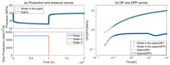 The ultimate computational results of pressure profiles and corresponding log–log PD curves for both analytical models, excluding wellbore storage and skin effect considerations, are presented in Figure 2. The numerical simulations reveal remarkable consistency between pressure computation outcomes and log–log PD curves, thereby validating the precision of the developed model in production performance prediction and pressure calculation applications.