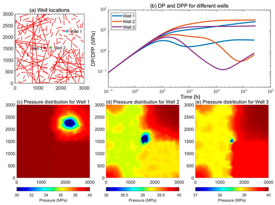 The density and scale of fracture distribution have a significant impact on the log–log pressure and PD curves. Figure 3a provides a schematic diagram of well locations with different fracture densities and scales, while Figure 3b illustrates the evolution of the log–log pressure and PD curves under varying fracture densities and scales. Well Location 1 is situated in an area with underdeveloped natural fractures, and the well-testing log–log curve exhibits distinct fracture linear flow characteristics. As the fracture density increases, the curve morphology evolves toward dual-porosity medium characteristics, and the reservoir pressure evolution pattern (Figure 3c) aligns with that of reservoirs with small-scale fracture development. Well Location 2 is located in a fracture-developed area, but the wellbore is not connected to natural fractures. The well-testing log–log curve is similar to that of reservoirs with medium-scale natural fractures, with the difference being a larger drop in the PD log–log curve during the fracture crossflow stage, indicating more interconnected fractures in the reservoir. Well Location 3 is closer to large-scale fractures, and the wellbore is connected to these fractures. Its PD log–log curve shows a wider opening, and the crossflow characteristics appear earlier. Combined with the pressure profile (Figure 3e), the pressure at Well Location 3 is primarily influenced by large-scale fractures, showing significant differences compared to the pressure evolution at Well Location 2 (Figure 3d).