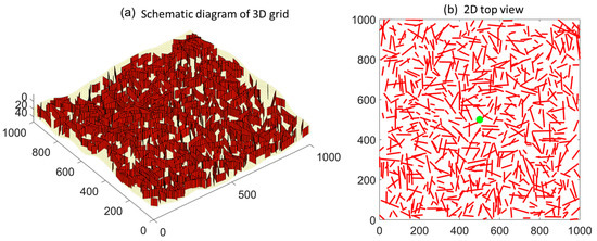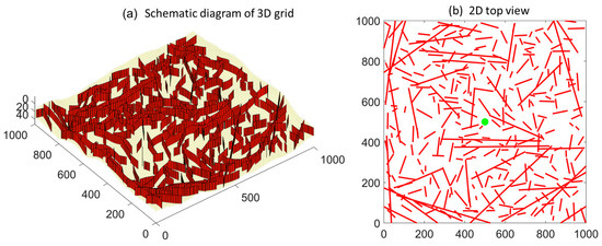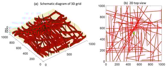 Figure 4 shows a schematic diagram of the model when large-scale fractures are developed in the reservoir. Figure 4a shows the 3D spatial fracture morphology, and Figure 4b shows the 2D plane fracture morphology, where the staggered distribution of red line segments represents the fracture morphology, and the green points represent vertical wells. The size of the gas reservoir geological model is 1000 m × 1000 m × 20 m, with the matrix grid dimensions being 201 × 201 × 5. A vertical well is located at the center of the gas reservoir, with a well radius of 0.1 m and a perforation thickness of 20 m. The original reservoir pressure is 40 MPa, the matrix porosity is 0.1, and the permeability is 0.01 × 10−3 μm2. The fluid properties are consistent with those in Table 1. It is assumed that large-scale fractures are well developed in the reservoir, while small- to medium-scale fractures are less developed. The model includes 48 large-scale fractures, each with a length greater than 500 m, and 30 medium-scale fractures, with lengths ranging from 100 m to 500 m. The flow capacity of large-scale fractures is 1 × 103 mD·m, while that of medium-scale fractures is 1 × 102 mD·m.
