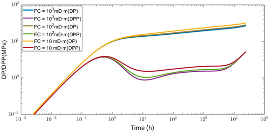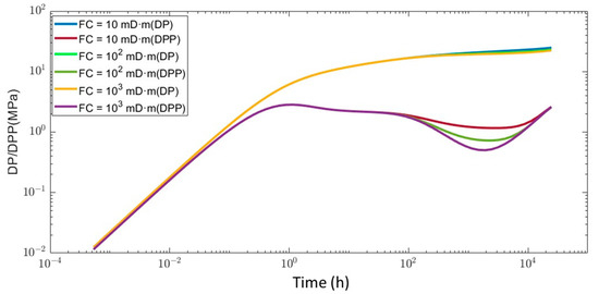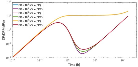 The DP test curves for the gas well were simulated for large-scale fracture flow capacities of 1 × 104 mD·m, 1 × 103 mD·m, and 1 × 102 mD·m. The pressure and PD log–log curves are shown in Figure 5. The research results indicate that the PD log–log curves exhibit three flow stages: the wellbore storage flow stage, the transient flow stage, and the complex large fracture flow stage. The pressure log–log curves show almost no difference, appearing as a horizontal straight line. In this geological model, the gas well’s PD curve, after passing through the wellbore storage and skin effect stages, directly enters the fracture flow stage. The greater the fracture conductivity (FC), the deeper the “cavity” in the PD curve, and the more pronounced the flow characteristic. Due to the high conductivity of the fractures, the pressure rapidly reaches the reservoir boundary. All DP curves eventually become straight lines with a slope of 1, influenced by the closed boundary.