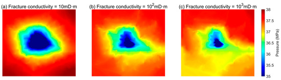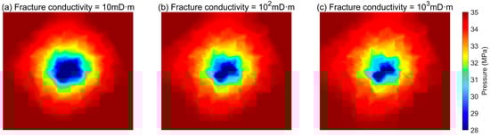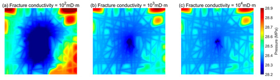 Figure 6 shows the pressure contour map of the reservoir at t = 10,000 h under different fracture conductivities. The pressure profile clearly reflects the characteristics of natural gas flow along fractures in the large-scale developed formation. The pressure wave diffuses rapidly, quickly affecting the entire large-scale fracture zone, and the DP within the fractures is significantly greater than that in the matrix. Under the same production rate, the FC determines the DP rate of the large-scale fracture system. The smaller the FC, the greater the DP in the large-scale fracture system near the wellbore.