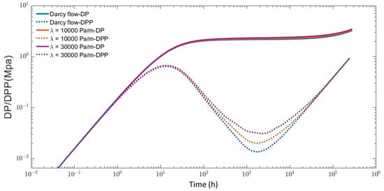 Figure 13 illustrates the impact of different λ values on the pressure response at a gas well production rate of 1 × 104 m3/d. In the figure, the solid lines represent the DP, while the dashed lines represent the DPP. The curve before t = 1 h is the wellbore reservoir stage, and after t = 10 h, it enters the fracture flow stage, where the high-velocity non-Darcy flow has a small impact. When t = 100 h, the flow enters the matrix-dominated stage, and the influence of low-velocity non-Darcy flow begins to increase. The results indicate that the low-velocity non-Darcy effect has little influence on fracture-dominated flow but significantly affects matrix-dominated flow. In the late stage of the curve, low-velocity non-DF causes the pressure curve to shift upward, indicating that as the low-velocity non-Darcy effect intensifies, the reservoir experiences greater pressure depletion.