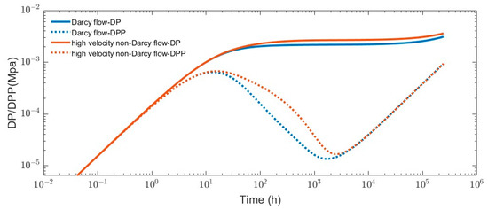 Figure 14 presents a comparison of the pressure responses between DF and high-velocity non-DF. The results show that non-DF generates additional DP, causing the pressure response curve to shift upward overall during the fracture-dominated flow stage. During the skin effect stage, the additional DP induced by high-velocity non-DF transforms into a rate-dependent pseudo-skin factor, leading to an upward shift in the high-velocity non-Darcy pressure response curve. In the early stage of the fracture-dominated flow stage, the additional DP caused by inertia results in increased pressure required to produce the same gas volume, thereby causing the pressure response curve to shift upward. In the late stage of the flow phase, fluid flow is primarily dominated by matrix flow, and the influence of high-velocity non-DF diminishes. The curve before t = 1 h is the wellbore reservoir stage, and after t = 10 h, it enters the fracture flow stage, where the high-velocity non-Darcy flow has a significant impact. After t = 5 × 103 h, it enters the matrix-dominated flow stage, where the high-speed non-Darcy flow effect basically disappears on the pressure derivative but still has a significant impact on the overall pressure.