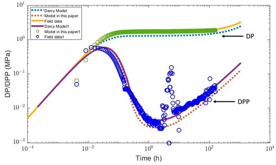 The well KS1 is located at the structural top of the gas reservoir, with a daily gas production of 38.1 × 104 m3 and no oil or water production. A pressure buildup test was conducted on the gas well in September 2021, lasting over 200 h. The well penetrated a reservoir thickness of 27.5 m, with a mid-formation pressure of 123.8 MPa and a temperature of 181.41 °C. The matrix porosity was 6.75%, and the gas specific gravity was 0.57. The pressure response curves from the DF model, the multi-scale flow model, and the actual bottomhole pressure are shown in Figure 15. The PD curve of the gas well does not exhibit a radial flow plateau. After the wellbore storage and skin effect stages, the curve immediately transitions into the fracture flow stage, showing a significant “concave” feature, indicating pronounced fracture flow characteristics. The overall curve behavior aligns with the pressure response characteristics of large-scale fracture development described earlier. The conventional dual-porosity well-test model cannot interpret the curve, and fitting is challenging. Consequently, a comprehensive numerical well-test analysis was performed utilizing the cornerpoint grid EDFM integrated with a multi-scale flow model, with comparative analysis conducted against the conventional DF model. The interpretation outcomes are detailed in Table 2, while the matching results are illustrated in Figure 15. The RMSE between the true DP value and the DP value fitted by the model in this paper is 0.0588, and the R2 is 0.8778; the RMSE between the true DPP value and the fitted DPP value is 0.0167, and the R2 is 0.7170. The RMSE between the Darcy model fitted DP value and the true DP value is 0.3932, the R2 is −9.5276, the RMSE between the true DPP value and the Darcy fitted DPP value is 0.0193, and the R2 is 0.6126, as shown in Table 3. Analysis reveals that the log–log pressure and PD curves generated by the DF model exhibit significant deviation from field measurements. In contrast, the log–log curves obtained through the multi-scale flow model developed in this research demonstrate excellent agreement with the observed data. These findings validate the reliability of the proposed model and establish a novel methodological approach for enhanced understanding of reservoir geological properties.