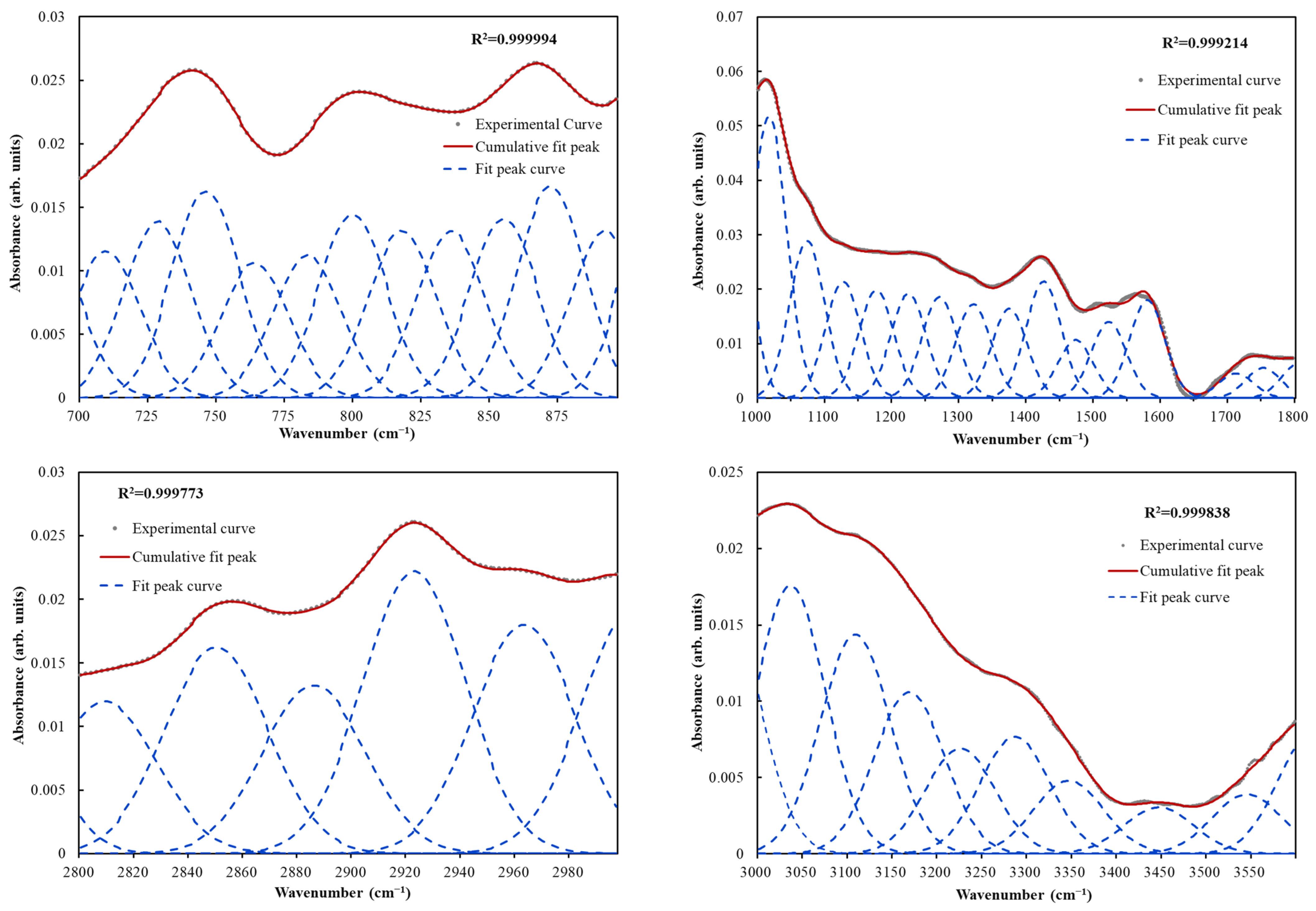 Due to the complex structure of coal rock, FTIR exhibits multiple absorption peaks corresponding to various functional groups. Therefore, PeakFit v4.12 software (Beijing Huanzhong Ruichi Technology Co., Ltd., Beijing, China) was employed to deconvolute the infrared spectrum of coal. The infrared spectrum can be divided into four primary absorption bands: aromatic structure (700–900 cm−1), oxygen-containing functional groups (1000–1800 cm−1), aliphatic structure (2000–2800 cm−1), and hydroxyl structure (3000–3600 cm−1). Each absorption band is fitted with several Gaussian functions, and the positions and areas of the sub-peaks are used to determine the types and contents of functional groups. According to the literature [30,31] and measured data, the fluctuation range of the main functional group absorption peaks in coal is shown in Table 3. As an example, the peak fitting diagrams for GA are shown in Figure 4.