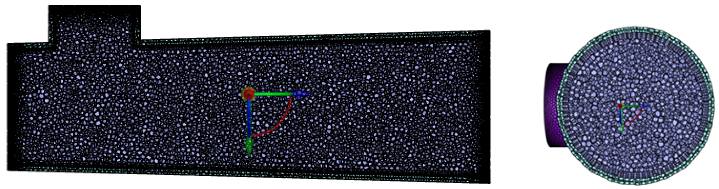 Mesh quality significantly affects computational accuracy and stability. Key factors that contribute to mesh quality include node distribution, smoothness, and cell shape. The Mesh Metrics option allows users to view information about these metrics to assess the overall mesh quality [28,29]. After generating the mesh, checking its quality is essential. Once meshing is completed in Fluent Meshing, this study employs a rigorous mesh quality assessment system to validate the computational domain systematically. By switching to the solving mode, the geometric properties of the mesh are evaluated across multiple dimensions, examining key metrics such as mesh orthogonality, aspect ratio, and warping. In this analysis, two inlets are set to different speeds. The final calculation results demonstrate the mesh’s convergence. The evaluation of the computed data reveals that the minimum mesh volume after meshing the cracked reactor is a positive value (6.232724 × 10−12), indicating there are no negative volumes in the mesh. This ensures the stability of numerical calculations. Furthermore, the mesh orthogonality qualities are all greater than 0.15, with the minimum mesh quality being 0.4724078. This indicates that the grids possess good orthogonal properties, which enhances the computational accuracy (Table 2).