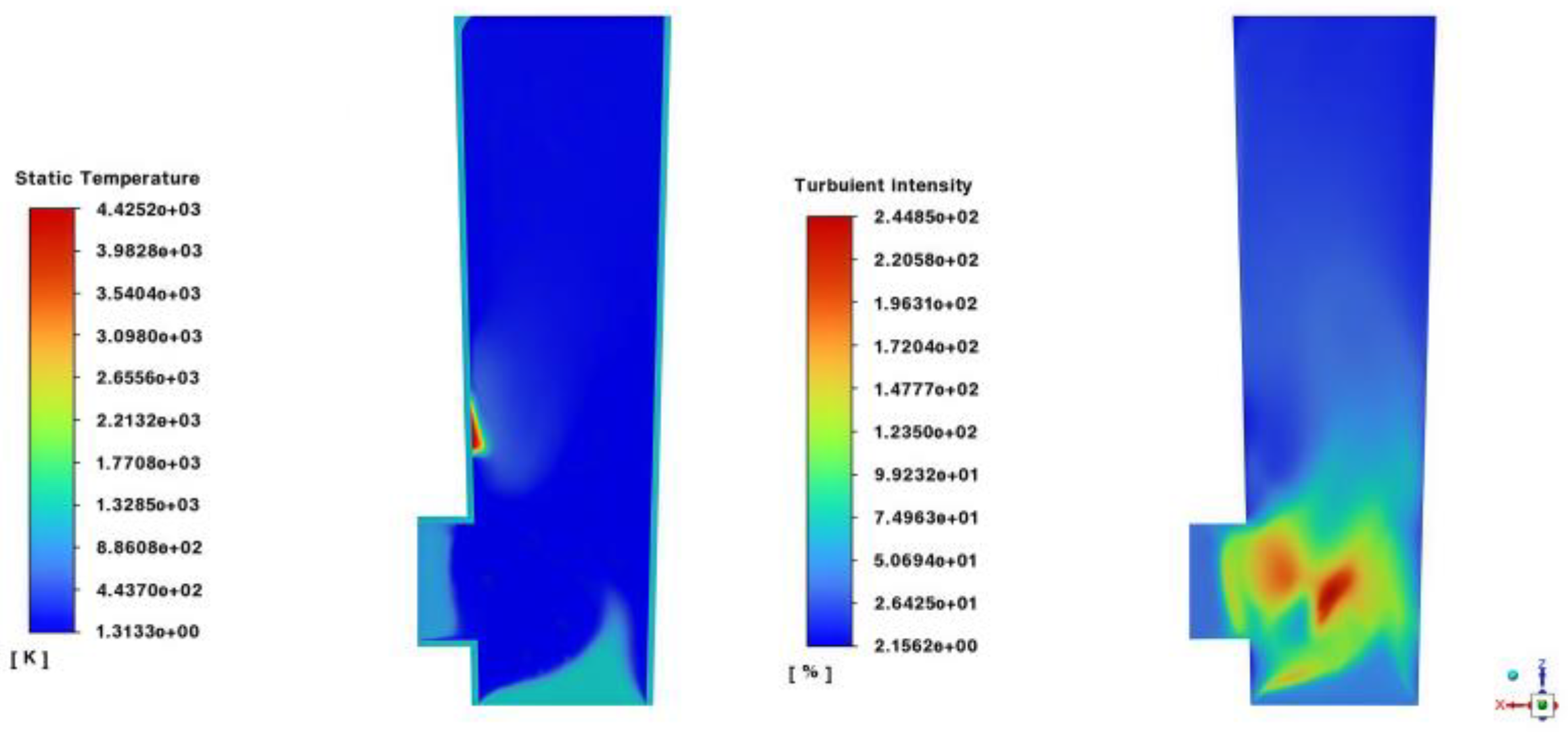 From Figure 5, it is evident that the maximum turbulence flow case for the k-ω model is higher than that of the k-ε model when two different turbulence models are compared. The k-ω model is more effective at predicting the anisotropy of turbulence in the studied reactor, particularly in the near-wall region and areas of separated flow. Additionally, in complex flow cases—such as those involving multiple turbulence sources or changes in flow direction—the k-ω model is better equipped to capture the intricacies of the flow, leading to a higher predicted turbulence intensity.