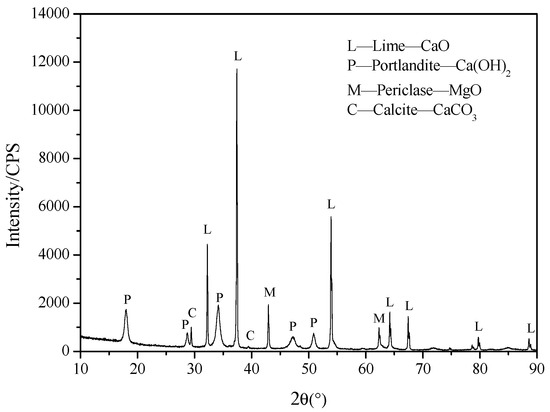 The lime raw material used in the test was locally quarried limestone from Laos, with its chemical composition described in Table 1. The limestone was crushed to −20 mm and then calcined at 1000 °C for 8 h. After calcination, the lime was ground in a SM φ500 × 500 test mill for 5 min to produce a binder for potash mine cemented backfill materials. Table 1 displays the chemical composition of the lime. The XRD pattern of the calcined and ground lime (Figure 1) revealed the primary minerals as lime (CaO), portlandite (Ca(OH)2), periclase (MgO), and calcite (CaCO3). The particle size distribution is shown in Table 2.
