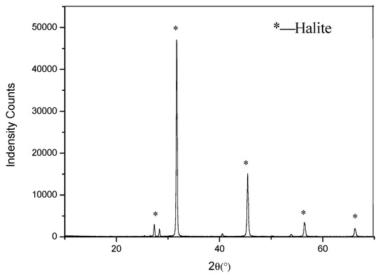 The potash mine tailings, upon receipt, exhibited a granular shape and colors ranging from colorless to milky white. The predominant mineral present in the tailings, as determined by X-ray diffraction, was NaCl, making up over 95% (Figure 2). The coarse-grained tailings (>2.5 mm) were separated and ground for 10 min using a SM φ500 × 500 mini mill. After grinding, the samples were blended with the fine-grained tailings (−2.5 mm) in the same proportion as before separation. This mixture constituted the final tailings used for preparing backfilling materials. The particle size distribution of the final tailings is presented in Table 3.