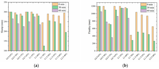 The measurement of slump and fluidity effectively indicates the flowability of filling material, aiding in the evaluation of its workability and quality. Ideal slump and fluidity are crucial for safely pumping filling materials. Figure 3 shows the slump and fluidity results of the backfill slurry after 0, 30, and 60 min of loop testing.