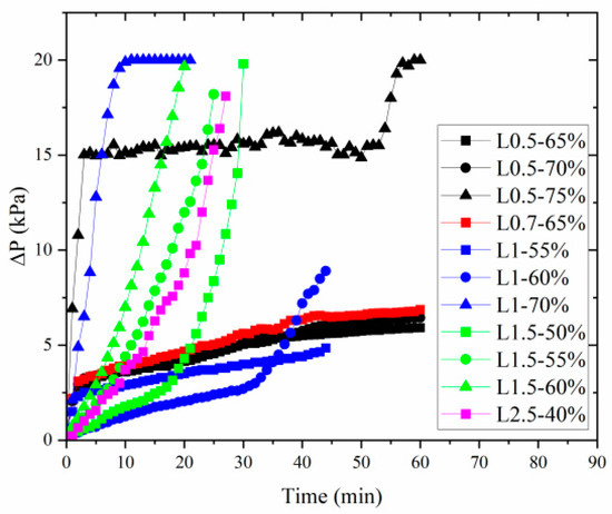 Type III: ∆P rapidly exceeds 15 kPa within the first 10 min and then stabilizes at a high level. The backfill slurries with a type III curve include L0.5-75% and L1-70%. This type of backfill slurry is prone to pipe blockage incidents due to excessive pressure loss in bent pipes.
