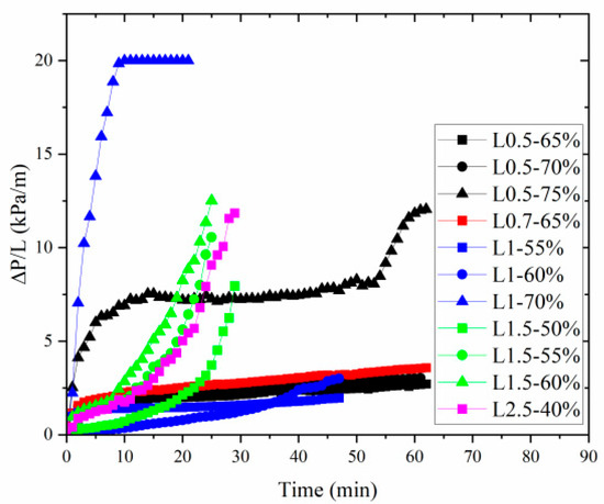When the lime dosage was 1.5% and 2.5%, the ∆P/L of backfill slurry exhibited a similar changing trend, increasing rapidly from the onset of loop testing. With a lime dosage of 1.5%, after 20 min of loop testing, the ∆P/L of the lime-cemented backfill slurry with 50%, 55%, and 60% solid contents were 2.1 KPa/m, 5.6 KPa/m, and 8.2 KPa/m, respectively. Subsequently, the ∆P/L of these backfill slurries increased sharply. The observable phenomenon was that the backfill slurry became particularly viscous and exhibited poor flowability. With a lime dosage of 2.5% and a solid content of 40%, the ∆P/L of the backfill slurry reached 5.0 KPa/m after 20 min of loop testing and subsequently rose swiftly to 11.8 KPa/m after 29 min. At this point, the backfill slurry had no flowability, mirroring the pressure difference change observed at the pipe bend in Figure 4.