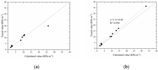 To verify the calculation formula for field application, a pipe diameter of 159 mm and a flow rate of 2.77 m/s were used in Equation (6) to calculate the pressure loss, which was then compared with field measurements. Figure 6b shows that the tested and calculated pressure loss per unit distance in the horizontal pipe demonstrates a linear correlation, despite some discrepancies. As pressure loss increases, the error also rises. The actual site closely aligns with the empirical formula. Introducing a k value can adjust the empirical formula to accurately calculate the pressure loss per unit distance at the backfill site.