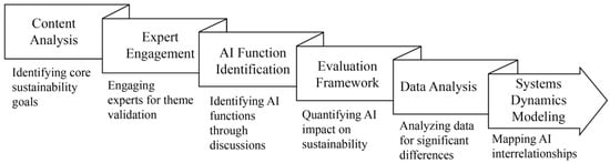 In the first CLD session, the selected experts were divided into four subgroups. Each subgroup collaboratively mapped causal links between the 17 AI functions and sustainability dimensions using digital whiteboards. The result was a preliminary CLD with identified reinforcing (R) and balancing (B) loops. In the second session, the initial model underwent refinement: experts revisited the structure, removed redundant links, and proposed additional interdependencies. A structured Likert voting mechanism (scale of 1–5) was implemented to rate the strength of each causal link. Only links rated ≥4.0 were retained to ensure consensus-based rigor. In the third session, the refined CLD was presented to all 48 experts, who then identified key leverage points where specific AI functions exhibited systemic influence. To verify the reliability of expert evaluations, Cohen’s Kappa (κ) was calculated to assess inter-rater agreement for each identified causal relationship. The resulting κ values ranged from 0.72 to 0.81, indicating substantial to near-perfect agreement, thereby confirming the reliability and robustness of the model. Figure 1 illustrates the sequential research design and methodological integration across all six phases, highlighting the empirical and analytical procedures used to generate, validate, and synthesize the study’s findings.