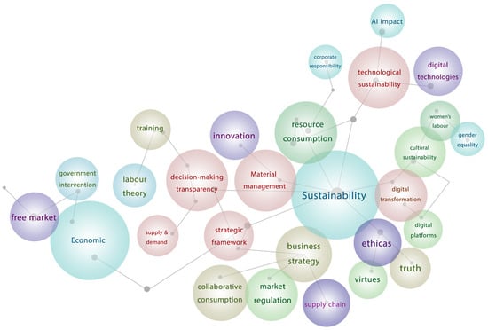 The analysis identified nine primary themes, each representing a distinct aspect of sustainability within Industry 5.0. Environmental sustainability, addressed in 25 articles, emphasizes carbon emission reduction, resource recycling, reuse, and supply chain management, underscoring Industry 5.0’s commitment to minimizing environmental impact. Social sustainability, supported by 17 articles, focuses on enhancing employee welfare, promoting social responsibility, and supporting community development. Economic sustainability, noted in 10 articles, emphasizes reducing costs, increasing productivity, and fostering flexible business models. Ethical sustainability, examined in 10 articles, addresses equitable resource distribution and transparency in decision making. Technological sustainability, referenced in eight articles, highlights the role of advanced technologies, such as the Internet of Things and big data, in enhancing efficiency and reducing environmental impact. Cultural sustainability, covered in eight articles, emphasizes preserving cultural identity and local values within production processes. Supply chain sustainability, discussed in eight articles, focuses on transparency within supply chains and managing product life cycles. Human sustainability, examined in eight articles, pertains to improving employee health and safety and creating secure work environments. Lastly, managerial sustainability emerges in 10 articles, highlighting the development of sustainable management strategies and international cooperation across supply chains. To examine the interactions and relationships among these themes, the Leximancer software (LexiDesktop5) was employed, producing a concept map based on term frequency and co-occurrence analysis. The resulting map, shown in Figure 2, visually illustrates the primary clusters identified, such as Social Welfare and Inclusivity, Ethical AI Integration, and Environmental Efficiency. The map also highlights a strong link between environmental sustainability and technological sustainability, underscoring the importance of green and intelligent technologies in Industry 5.0 for minimizing environmental impact.