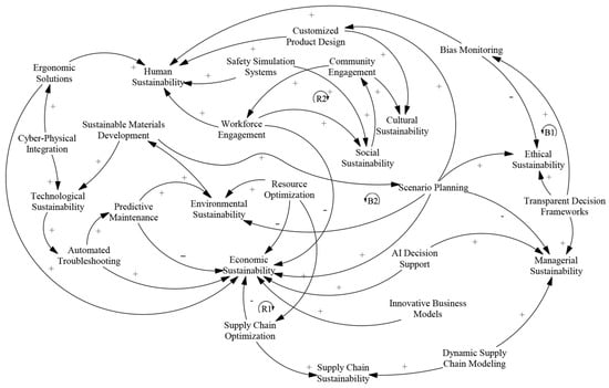 The development of the CLD, constructed using Vensim and depicted in Figure 3, provides a systemic lens through which to understand the interactions and feedback mechanisms among the 17 identified GAI functions. In contrast to the discrete statistical insights presented in Section 5.3, which quantified and ranked individual functions, this systems-based model synthesizes the complex interdependencies linking various AI applications to the multiple sustainability dimensions of Industry 5.0. By visually representing both reinforcing (R) and balancing (B) feedback loops, the CLD highlights how the integration of these functions yields emergent behaviors and dynamic trajectories that cannot be fully captured by static statistical metrics alone.