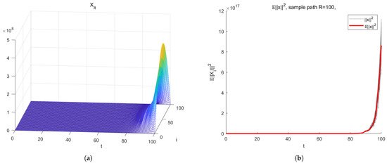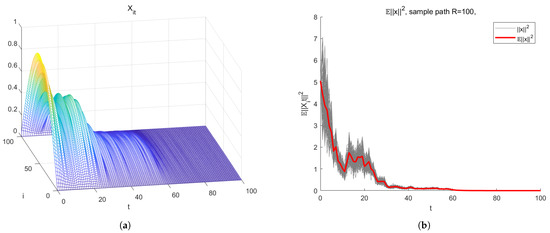 where , , . , let , then we can get . Meanwhile, we take the initial value as . The simulation results are shown in Figure 1. Figure 1a depicts the state surfaces of the first sample path. And the state trajectories of 100 sample paths for the system (29) are shown as the light line in Figure 1b.