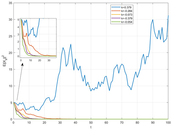 To show the relationship between the feedback gain k and the convergence condition in Theorem 2, five sets of feedback gain for the same control system are selected: , with corresponding values of , , , , and , respectively.