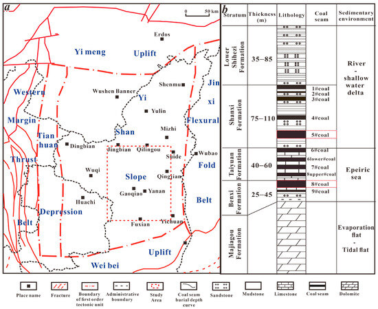 The Yan’an Gas Field is located in the southeastern part of the Ordos Basin, geographically covering Yan’an City, Shaanxi Province, and its surrounding areas (Figure 1). Tectonically, it is situated in the transitional area between Yishan Slope and the Weibei Uplift [17]. Second only to the Tarim Basin in sedimentary volume in China, the Ordos Basin exhibits a predominant north–south structural trend, covering an area of approximately 3.7 × 105 km2. Affected by the compression of the Qinling Orogenic Belt at the southern margin of the basin, multiple phases of thrust fault systems have developed. However, the southern slope zone where the Yan’an Gas Field is located has a relatively gentle structure, and the general dip angle of the strata is less than 5° [18]. The deep coal-bearing strata in this area mainly occur within the Shanxi Formation of the Upper Paleozoic Permian and the Yan’an Formation of the Mesozoic Jurassic. The burial depth of the Shanxi Formation ranges from 2000 to 3500 m, belonging to a transgressive delta-coastal environment. The reservoir in the second member of the Shanxi Formation is mainly composed of fine- to medium-grained quartz sandstone (quartz more than 80%), with a porosity of less than 10% and a permeability of less than 1 mD, belonging to tight sandstone. The reservoir space is mainly composed of secondary dissolved pores and microfractures, which are controlled by siliceous cementation and dissolution [19,20]. The roof and floor of the coal reservoir are mostly mudstone or siltstone, forming good sealing conditions. The interbedding of the coal reservoir and sandstone forms a “sandwich” structure, providing a channel for the vertical migration of natural gas. The deep coal reservoirs in the Yan’an Gas Field have been superimposed and reconstructed by the Indosinian and Yanshanian tectonic movements, forming broad and gentle folds and local small faults. The formation pressure coefficient ranges from 0.9 to 1.1, belonging to a normal-pressure system, but locally, high-pressure sealed boxes are formed due to differential compaction [19]. The gas reservoir type is mainly of the lithological–structural composite type, and the enrichment of natural gas is jointly controlled by sedimentary microfacies (such as the distribution of channel sand bodies) and structural highs [20]. This study mainly focuses on the No. 5 coal seam of the Shanxi Formation and the No. 8 coal seam of the Benxi Formation in the Yan’an Gas Field, with a burial depth of over 2000 m, which belong to deep coal. In this study, a total of 16 samples were collected from four wells, namely J2, J3, J5, and J6.