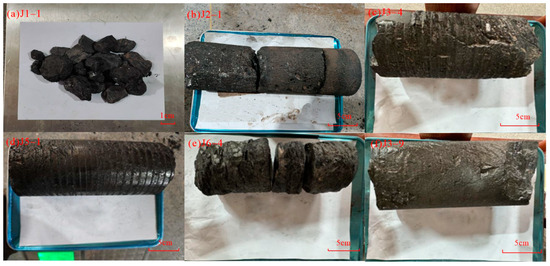 Based on the naked eye observation of hand specimens, the macroscopic maceral components of the samples in the study area are mainly semi-bright coal, with a small portion being dull coal and semi-bright coal. Overall, the samples are relatively intact and exhibit a columnar structure, while some coal samples show a fragmented blocky shape. The samples in the study area are mainly massive and banded, and some also have a layered structure. The observable characteristics of different samples with the naked eye vary as well. For coal sample J1-1 (Figure 2a), this sample generally has a strong luster, appearing grayish-black with a vitreous luster. It has a relatively high hardness and an uneven fracture. However, the endogenous cleats and exogenous fractures are not easily observable. The carbonaceous mudstone and semi-bright coal of this sample are both in a fragmented blocky state and are mixed together. For coal sample J2-1 (Figure 2b), it has a relatively strong overall luster, appearing grayish-black with a vitreous luster. It has a relatively high hardness and an uneven conchoidal fracture. At the same time, this coal sample also develops two groups of cleats approximately perpendicular to the bedding plane, namely face cleats and butt cleats. These two groups of cleats are perpendicular or obliquely intersecting. The endogenous cleats are partially filled with calcite films, the exogenous fractures are completely filled with calcite veins, a 5 cm thick carbonaceous mudstone develops in the middle, and a pyrite band is present. The coal sample also has a banded structure. For coal sample J3-4 (Figure 2c), this sample has an asphaltic luster, a stepped fracture, and a relatively high hardness. At the same time, the butt cleats show a spacing > 10 cm, but the face cleats are developed, with a length of 3 cm for the face cleats. It is worth noting that the endogenous fractures of the coal sample are filled with calcium carbonate. For coal sample J5-1 (Figure 2d), it appears blackish-gray, with an adamantine luster and a stepped fracture, but the fractures of the coal sample are not developed. For coal sample J6-4 (Figure 2e), it has a silky luster, a conchoidal fracture, and a relatively high hardness. At the same time, a 4.5 cm thick gangue interlayer can be observed. It is worth noting that the face cleats of this sample are developed, while the butt cleats show a spacing > 8 cm. There is a 1 cm long face cleat, and the endogenous fractures are filled with calcium carbonate. For coal sample J3-9 (Figure 2f), it has a vitreous luster, a stepped fracture, and a relatively high hardness. It is worth noting that the butt cleats show a spacing > 10 cm, but the face cleats are developed, and the endogenous fractures are filled with calcium carbonate.