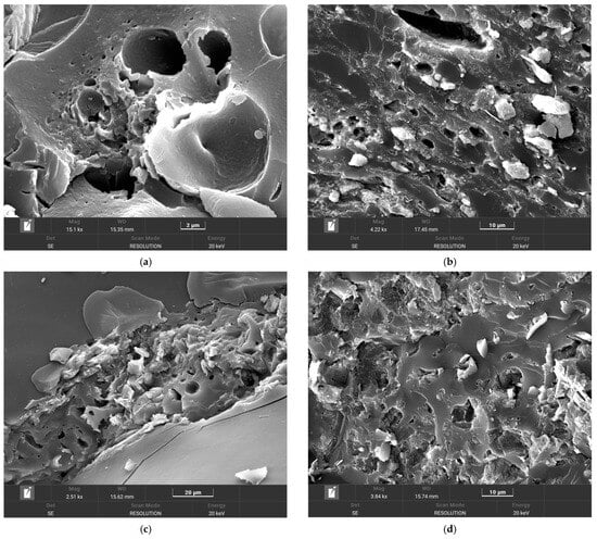 Scanning electron microscopy (SEM) has distinct advantages in observing the material composition of coal samples and the development of pore-fracture structures at the microscopic level. For sample J2-1 (Figure 3a), the main component of the sample is vitrinite, with sporadic occurrences of alginite. Pores can be observed inside some vitrinite, and sclerotia can also be seen. For sample J3-3 (Figure 3b), the main component of the sample is vitrinite, and part of the vitrinite is distributed in a banded pattern. Pores can be observed, and some of the pores are filled with argillaceous particles. Sporadic alginite can be seen on the surface of local grains. For sample J5-2 (Figure 3c), the main component of the sample is vitrinite, and pores can be observed inside the vitrinite, which are locally distributed in groups. Argillaceous particles and the like can be seen filling the pores and microfractures, and alginite development can be seen on the surface of local grains. Pores can be observed inside, which are locally distributed in groups. Argillaceous particles and the like can be seen filling the pores and microfractures. For sample J6-1 (Figure 3d), the main component of the sample is vitrinite, with local occurrences of fusinite. Pores can be observed in the vitrinite. Clay minerals such as illite and illite-smectite mixed layers can be seen between local grains. Authigenic minerals and the like can be seen filling the microfractures locally. Pores can be observed. Clay minerals such as illite and illite-smectite mixed layers can be seen between local grains. Authigenic minerals and the like can be seen filling the microfractures locally.