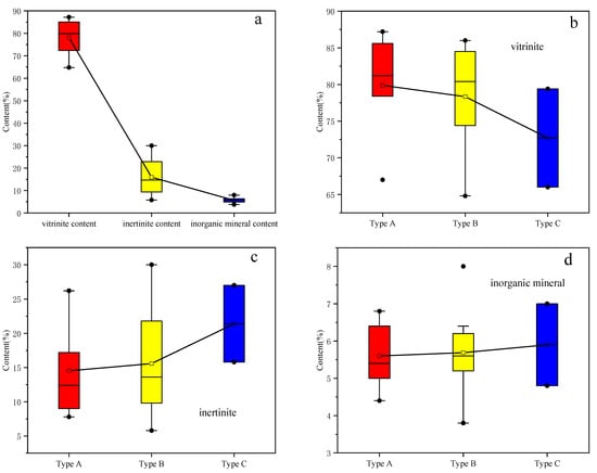 As can be seen from the statistical results (Figure 4), the maceral composition content is mainly the vitrinite group, followed by the inertinite group, and the content of inorganic minerals is the least. The content of the vitrinite group in Type A ranges from 67% to 87.2%, the content of the inertinite group ranges from 7.8% to 26.2%, and the content of inorganic minerals ranges from 4.4% to 6.8%. The content of the vitrinite group in Type B ranges from 64.8% to 85.8%, the content of the inertinite group ranges from 5.8% to 30%, and the content of inorganic minerals ranges from 3.8% to 6.4%. The content of the vitrinite group in Type C ranges from 66% to 79.4%, the content of the inertinite group ranges from 15.8% to 27%, and the content of inorganic minerals ranges from 4.8% to 7%. For the samples with three different ash contents, as the ash content increases, the content of the vitrinite group shows a decreasing trend. At the same time, in contrast to the vitrinite group, the content of the inertinite group shows an increasing trend with the increase in the ash content. It is worth noting that the content of inorganic minerals is less affected by the ash content, and the difference is not obvious.