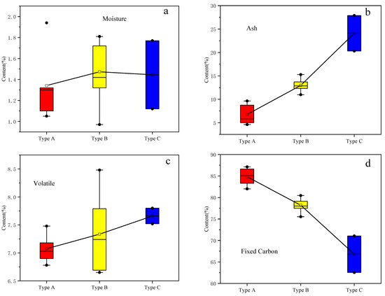 As shown in Figure 5, the moisture of Type B samples is highest, and that of Type A samples is lowest. At the same time, the volatile matter of Type C samples is highest, followed by that of Type B samples, and then that of Type A samples. Fixed carbon and ash are the main components of proximate analysis components. Type A samples have the lowest ash content and the highest fixed carbon, while Type C samples have the highest ash content and the lowest fixed carbon.