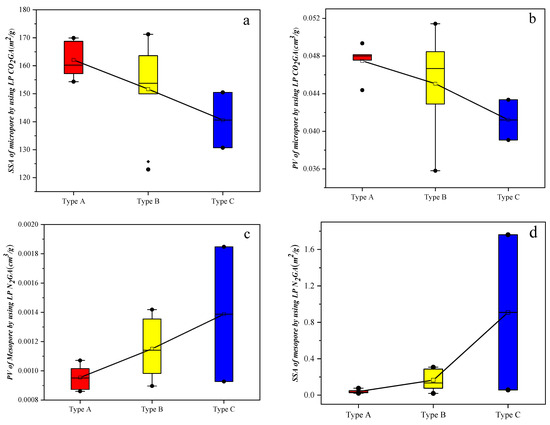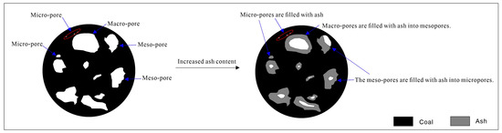 In contrast, micropore characteristics exhibited an overall declining trend. The micropore specific surface area decreased by 2.3% in Type B samples relative to Type A, with Type C samples showing more pronounced reductions of 4.8% compared to Type A and 2.5% compared to Type B. Similarly, micropore volume demonstrated modest decreases, with Type B samples showing a 1.8% reduction compared to Type A, while Type C samples decreased by 4.7% and 2.9% relative to Types A and B, respectively. Under different ash contents, the PV and SSA of micropores show a decreasing trend as the ash content increases. This is because the ash will fill the micropores, leading to a reduction in their PV and SSA. Unlike micropores, the PV and SSA of mesopores show an increasing trend as the ash content increases. This indicates that while the ash fills the micropores, under certain conditions, the ash may form new mesopores through the interaction between minerals and organic matter [26,27].