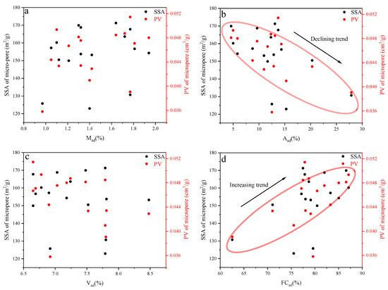 Based on the experimental results of the carbon dioxide adsorption experiment and the proximate analysis experiment (Figure 7), there is a distinct negative correlation between the ash content in the samples and the PV and SSA of the micropores. This indicates that the ash content is the major controlling factor affecting the pore structure of the micropores. The reason for this phenomenon is that the increase in the ash content causes the micropores in samples to be filled, resulting in a decrease in the PV and SSA of the micropores (Figure 8). It is worth noting that there is a certain positive correlation between the fixed carbon and the PV and SSA of the micropores. This is because as the content of fixed carbon increases, the molecular arrangement in the samples becomes more regular, increasing the number of pores in the coal samples [28]. As the degree of coal thermal evolution rises, the content of fixed carbon in the coal gradually increases, while the contents of volatile matter and moisture decrease. In the deep coal reservoir, high coalification promotes the condensation of aromatic structures and the development of micropores. This reflects the promoting effect of the increasing fixed carbon, which rises with the increase in the degree of thermal evolution, on the micropore structure [29]. The research results show that in this study, the correlations between the contents of moisture and volatile matter and the PV and SSA of micropores are not obvious.