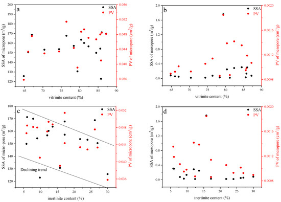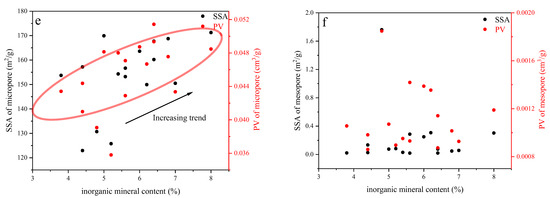 As can be seen from the statistical results (Figure 9), the contents of the vitrinite group, inertinite group, and inorganic minerals have no obvious influence on the pore-fracture structure of mesopores. However, there is a certain negative correlation between the content of the inertinite group and the PV and SSA of micropores, indicating that the inertinite group affects the evolution of the micropore structure. There is a positive correlation trend between the mineral composition and the PV and SSA of micropores, indicating that with the increase in the content of inorganic mineral composition in samples, the micropores in samples are more developed. This may be because some minerals in the inorganic minerals are conducive to the development of micropores. At the same time, in the visual identification of samples, it can be observed that calcite obviously fills the endogenous and exogenous fractures of samples, which also shows that the mineral composition has a very important influence on the evolution of the pore-fracture structure of coal samples.