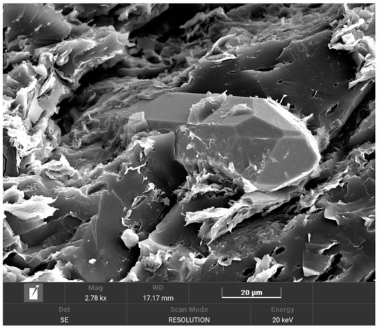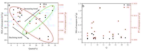 According to Figure 10, quartz in the inorganic mineral composition has a relatively complex influence on the development of micropores. On one hand, the increase in the content of quartz can provide support for the formation of micropores. On the other hand, the presence of quartz will also occupy the space of micropores, thus affecting the development of micropores (Figure 11). The influences of calcite and clay minerals on the development of nanopores are relatively complex. The increase in the content of calcite occupies the space of micropores in coal samples, thus reducing the PV and SSA of micropores. At the same time, if calcite is corroded, new pores will be generated, which will also increase the PV and SSA of micropores in coal samples. However, existing experiments cannot effectively identify the substances that form the micropores. Additionally, clay minerals commonly occlude nanopores, thereby significantly reducing the effective porosity of coal. However, in this study, the influences of calcite and clay minerals on the evolution of the pore-fracture structure are not obvious.
