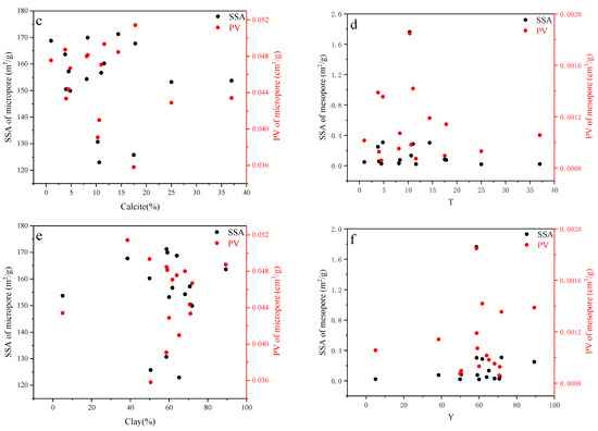 Correlations between the pore structure parameters of nanopores and the mineral composition (a–f).