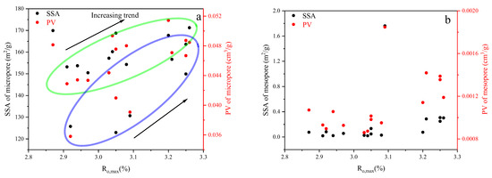 The maximum vitrinite reflectance of coal samples reflects the degree of thermal evolution of coal rock samples. In this study, the degree of thermal evolution of samples is relatively high (Figure 12), all above 2.8%, and they are in the over-mature stage [30]. As the degree of thermal evolution increases, the coal gradually becomes denser, resulting in a decrease in the porosity of the coal. The increase in thermal evolution degree usually improves the gas storage capacity of coal [31]. As can be seen from Figure 12, with the increase in the degree of thermal evolution of samples, the PV and SSA of micropores increase, enhancing the gas storage capacity of coal. This is because as the degree of thermal evolution increases, although the overall porosity is decreasing, more pores in the coal samples are transformed into micropores, leading to an increase in the PV and SSA of micropores [32]. However, in this study, no obvious correlation between mesopores and the degree of thermal evolution has been observed.