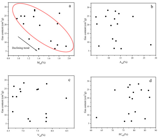 The statistical results show (Figure 13) that the influence of proximate analysis components on the gas content is relatively complex. Among them, a relatively obvious negative correlation can be observed between the moisture content and the gas content. This is because deep coalbed gas is different from shallow coalbed gas. Deep coalbed gas exists in a state where free gas and adsorbed gas coexist, while shallow coalbed gas mainly exists in the form of adsorbed gas [33]. The increase in moisture will occupy the space in the pores, which is not conducive to the occurrence of adsorbed methane, thus decreasing the gas content [34]. There is no obvious correlation between the ash content and the gas content. However, a high ash content will fill the pores in coal samples, reducing the occurrence space of coalbed gas, thus causing the CBM to decrease. There is no obvious correlation between the volatile matter and the gas content. Fixed carbon refers to the content of the remaining organic components in coal after removing the contents of moisture, ash, and volatile matter. The fixed carbon of coal samples is above 60%. The higher the fixed carbon, the better the material basis for gas generation in coal.
