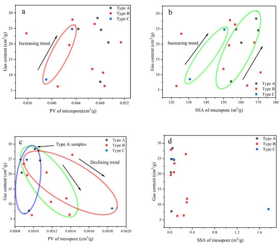 For mesopores, with the increase in the PV of mesopores, the gas content of samples of Type A increases. However, there is an obvious negative correlation trend between the gas contents of Type B and Type C and the PV of mesopores. This suggests that at a low ash content, its impact on mesopores is minimal, allowing an increase in the PV of mesopores to enhance coalbed methane storage capacity. As the ash content increases, its impact on mesopores becomes more pronounced, resulting in gas content being jointly influenced by multiple factors. There is no obvious relationship between the SSA of mesopores and the gas content. At the same time, the SSA of micropores is much larger than that of mesopores, which is the main occurrence location of adsorbed coalbed gas.