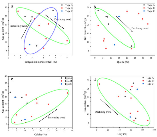 As can be seen from Figure 15, there is a complex relationship between the inorganic mineral composition and the gas content. Overall, there is a dual and complex relationship of both positive and negative correlations between the content of inorganic minerals and the gas content, which requires further in-depth discussion. There is an obvious negative correlation between the quartz content of the samples of Type A and the gas content. Quartz plays a certain positive role in the formation of pores. The increase in its content can provide support for the pores and increase the pore space of the samples, thus providing more occurrence space for coalbed gas. However, an excessively high quartz content will also occupy the pore space, thus reducing the occurrence space of coalbed gas. For the influence of calcite composed of coal minerals on pore-fracture structure, it is necessary to distinguish the fact that calcite in coal is a primary and secondary mineralization process. The influence of primary mineral calcite on the pore-fracture structure is mainly in the form of occupying the space for the development of the pore-fracture structure. The secondary mineralized calcite will produce new pores. There is an obvious negative correlation between the content of clay minerals and the gas content. As the clay mineral content increases, these minerals progressively fill the pore spaces, resulting in reduced sample porosity and correspondingly decreased storage potential for coalbed gas.