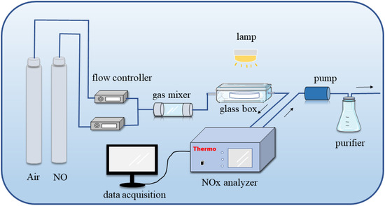 The photocatalytic degradation activities of T and Ni–TiO2 (NIT) were evaluated using methylene blue (MB) and nitric oxide (NO) as model pollutants. A schematic diagram of the NO degradation setup is illustrated in Figure 2. The photocatalytic procedure was conducted as follows: