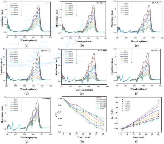 Continuous UV–Vis spectra of T and NIT samples: (a) T; (b) 0.1% NIT; (c) 0.3% NIT; (d) 0.5% NIT; (e) 0.7% NIT; (f) 0.9% NIT; (g) 1% NIT; (h) MB photodegradation C/C0 curves of different samples; and (i) MB photodegradation diagrams of different samples (C/C0) versus time.