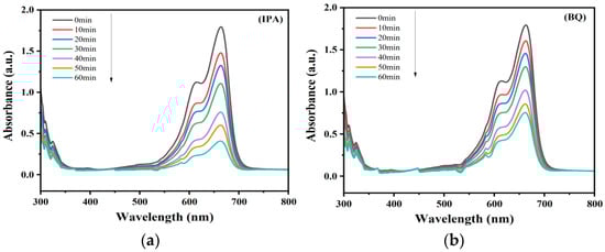 According to relevant studies, the investigation of methylene blue (MB) degradation mechanisms via radical scavengers is a feasible approach to identify the dominant reactive species in TiO2-mediated photocatalytic processes. The primary function of scavengers lies in their ability to selectively trap specific radicals, thereby elucidating the contribution of individual reactive species (e.g., hydroxyl radicals ·OH, superoxide radicals ·O2−, or holes h+) to the overall degradation pathway. When investigating the degradation mechanism of MB using radical scavengers, the adsorption strength of scavengers on TiO2 surfaces and pH variations during the process can exert certain influences on the reaction efficiency. However, most studies implicitly assume that the addition of scavengers is uniformly distributed in the solution, suggesting the influence of a very small amount of scavengers on the TiO2 surface.