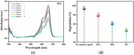 Continuous UV–Vis spectra with different capture agents: (a) IPA; (b) BQ; (c) KI; and (d) visible-light degradation rate.