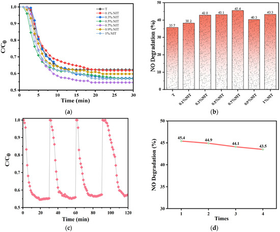 Photocatalytic degradation of NO by NIT in samples with different doping concentrations (a,b); test results for NO cyclic degradation by 0.7% NIT (c,d).