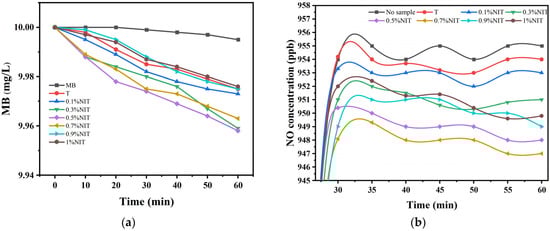 Figure 6 demonstrates the adsorption performance of NIT samples toward methylene blue (MB) and nitric oxide (NO) in dark conditions. As illustrated in Figure 6a, no significant variation in MB concentration was observed without photocatalysts, while the introduction of NIT samples induced a gradual decline in the MB concentration over time, with the 0.3–0.7% NIT samples exhibiting markedly superior adsorption capacities compared to other doping levels. Figure 6b reveals that the NO concentration remained stable in the absence of catalysts, whereas all the NIT-doped samples progressively reduced the NO concentration during adsorption, particularly the 0.5% and 0.7% NIT samples, which showed optimal performance. This adsorption enhancement can be attributed to three principal mechanisms: (1) lattice defects (e.g., oxygen vacancies) generated by Ni2+ substitution for Ti4+ served as electron-enriched regions in darkness, facilitating enhanced chemical bonding interactions with the lone electron pairs of MB amino groups or NO free radicals; (2) Ni2+ species act as active sites for direct coordination adsorption; and (3) distinct adsorption pathways governed by pollutant characteristics, namely MB adsorption primarily involved electrostatic interactions, π-π stacking, and hydrogen bonding, amplified through Ni-induced surface charge modulation and π-conjugated structure optimization, while NO adsorption relied on oxygen vacancy-mediated chemical adsorption (via NO2−/NO3− formation) coupled with physical adsorption. Notably, excessive Ni doping (>0.7%) induced surface over-modification, causing microporous blockage and active site occlusion that compromised the NO adsorption efficiency. These findings demonstrate that Ni doping levels critically regulate adsorption performance through synergistic effects between the pollutant’s molecular properties and the defect state distribution on the material surfaces.