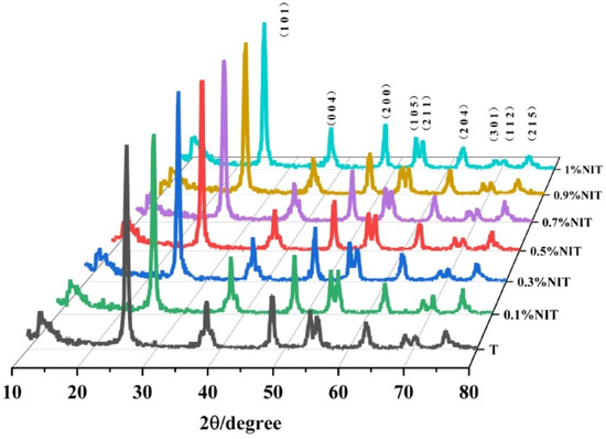 Figure 7 displays the XRD patterns of TiO2 and Ni-doped TiO2 (NIT), confirming the anatase phase structure. The diffraction peaks at 2θ = 25.3°, 37.9°, 48.2°, 54.0°, 55.2°, and 62.8° correspond to the (101), (004), (200), (105), (211), and (204) crystal planes of anatase TiO2 [43]. Notably, no characteristic peaks of nickel oxide (NiO) are observed in the NIT patterns, indicating that Ni2+ doping does not alter the TiO2 lattice structure, and Ni2+ is likely incorporated into the anatase framework via substitutional doping.