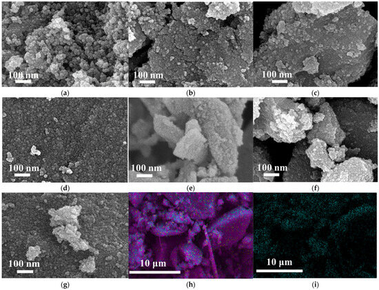 Figure 8 displays the SEM images of pure TiO2 and Ni-doped TiO2 (NIT) with varying Ni2+/Ti4+ ratios (0.1–1.0 wt%). As shown in Figure 8a, pure TiO2 exhibits a granular and near-spherical morphology, with densely aggregated particles and uniform size distribution. Figure 8b–g illustrates the microstructures of the NIT samples (0.1–1.0 wt% Ni2+/Ti4+), revealing no significant differences in the nanoparticle size or distribution compared to pure TiO2. Notably, the 0.7 wt% NIT sample displays a distinct plate-like morphology, which may enhance active site exposure for MB and NO degradation. To our knowledge, this work reports the first synthesis of plate-like Ni–TiO2 via a sol–gel method, combined with mechanical ball milling of the gel precursors.