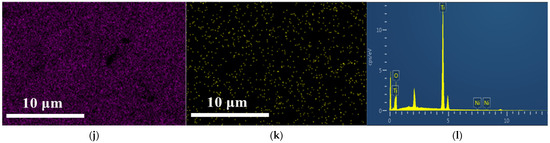 Figure 8h–k presents the elemental mapping of 0.7 wt% NIT, demonstrating uniform spatial distributions of Ni and Ti atoms across the plate-like morphology. This homogeneous dispersion facilitates efficient charge carrier transport at the NIT interface. Energy-dispersive X-ray spectroscopy (EDS) analysis (Figure 8l) confirms the coexistence of Ti, O, and Ni in the catalyst. The observed non-stoichiometric oxygen deficiency likely originates from surface oxygen vacancies, which are known to enhance photocatalytic activity by modulating electronic properties.