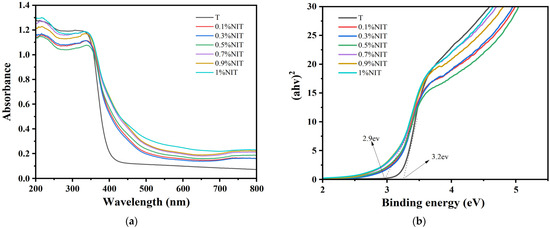 To investigate the influence of the Ni doping content on the optical absorption edge and bandgap of TiO2 nanoparticles, UV–Vis diffuse reflectance spectroscopy (DRS) was conducted on the pure TiO2 and NIT samples. As shown in Figure 9a, pure TiO2 exhibits strong absorption exclusively in the ultraviolet region (λ < 400 nm), with negligible absorption in the visible range (400–500 nm). In contrast, Ni-doped TiO2 demonstrates a progressive redshift in the absorption edge toward longer wavelengths with increasing Ni content. A distinct shoulder-like absorption feature emerges within the 400–500 nm range, accompanied by a significant redshift. Beyond 500 nm, the NIT samples display a broader absorption edge compared to pure TiO2.