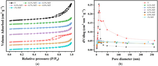 (a) Nitrogen adsorption and desorption isotherms of samples with different amounts of NIT; (b) pore size distribution in samples with different NIT content.