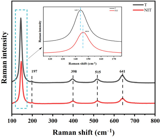 The Raman spectra presented in Figure 11 demonstrate that both pristine TiO2 and the 0.7% NIT samples exhibit a prominent peak at 144 cm−1, along with four characteristic moderate peaks located at 197 cm−1, 398 cm−1, 515 cm−1, and 641 cm−1. These spectral features correspond to the six Raman-active vibrational modes characteristic of anatase-structured TiO2 [47,48]. Comparative analysis with pure TiO2 reveals that the synthesized Ni-doped TiO2 samples exhibit nearly identical Raman features without detectable nickel oxide signatures, confirming that Ni incorporation does not substantially alter the fundamental TiO2 framework, a conclusion consistent with the XRD observations. Notably, the NIT sample exhibits a slight blueshift (~144 cm−1), accompanied by peak broadening and intensity reduction relative to undoped TiO2. This phenomenon may be attributed to lattice defects induced by electron donation from incorporated Ni species, which distort the crystal symmetry. Previous studies have established that heteroatom substitution can generate such structural imperfections, thereby facilitating enhanced electron transfer efficiency and improved catalytic activity [49].